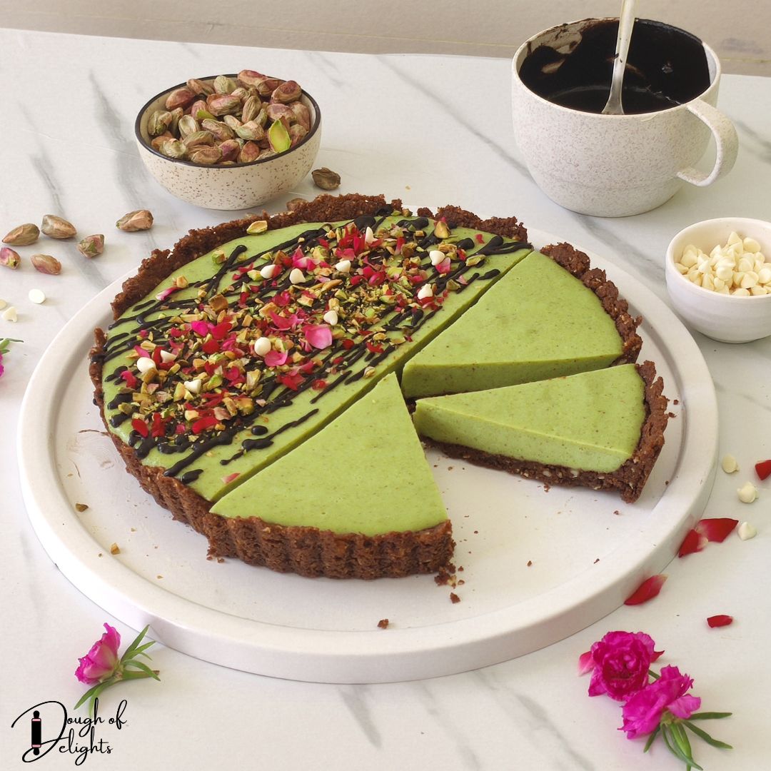 This tart takes inspiration from Middle Eastern flavors with a soft nod to rose petals and pistachios—think of it like baklava’s fancier, cooler cousin.