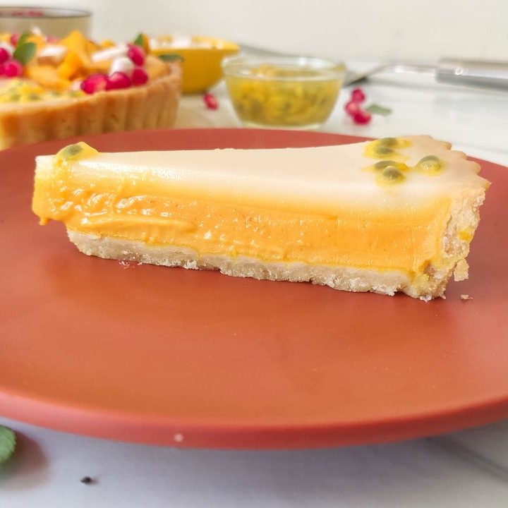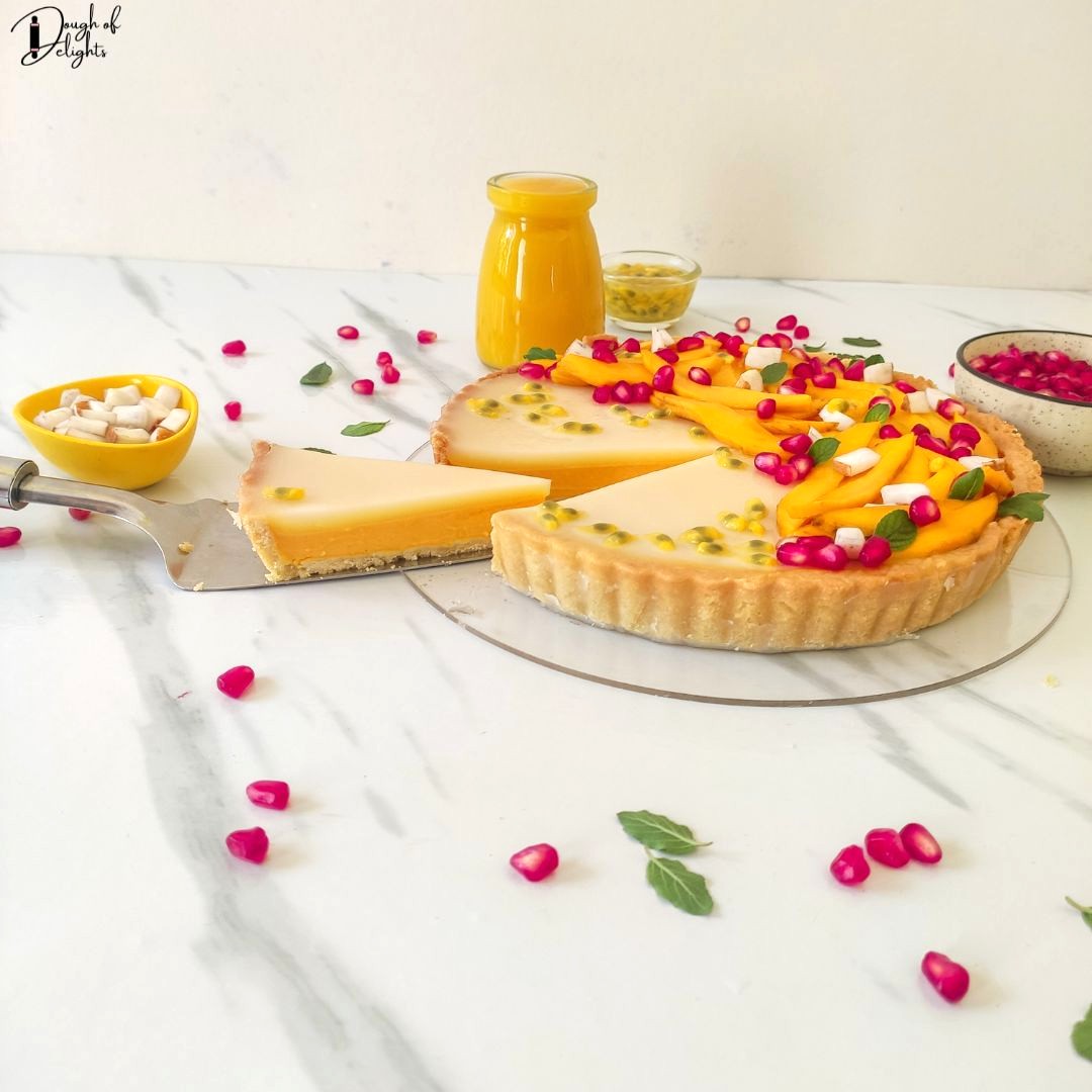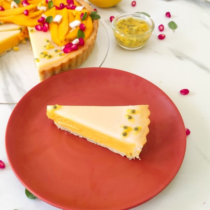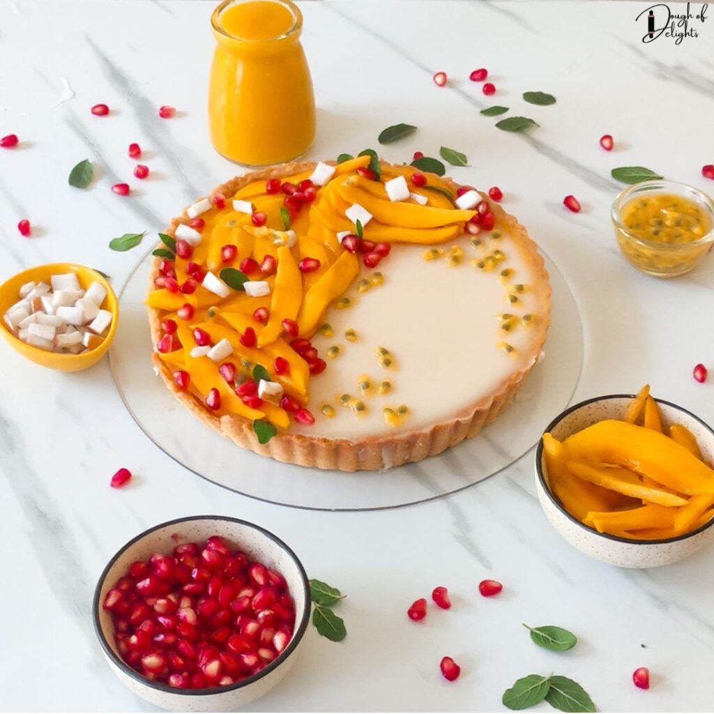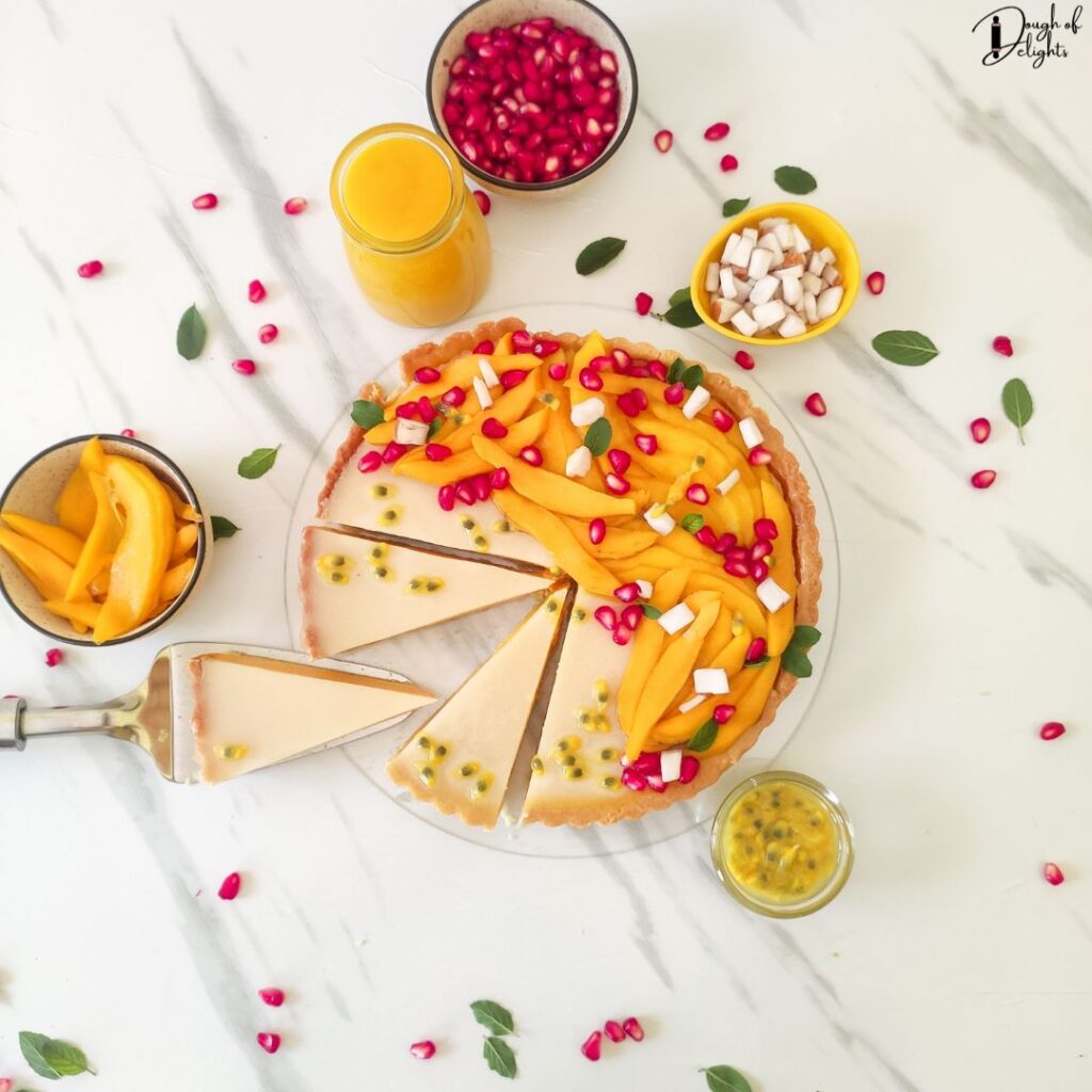 1. Refrigerate the entire tart for 4–6 hours until set. Garnish with mango slices, pomegranate seeds, passion fruit, coconut pieces, and mint leaves.