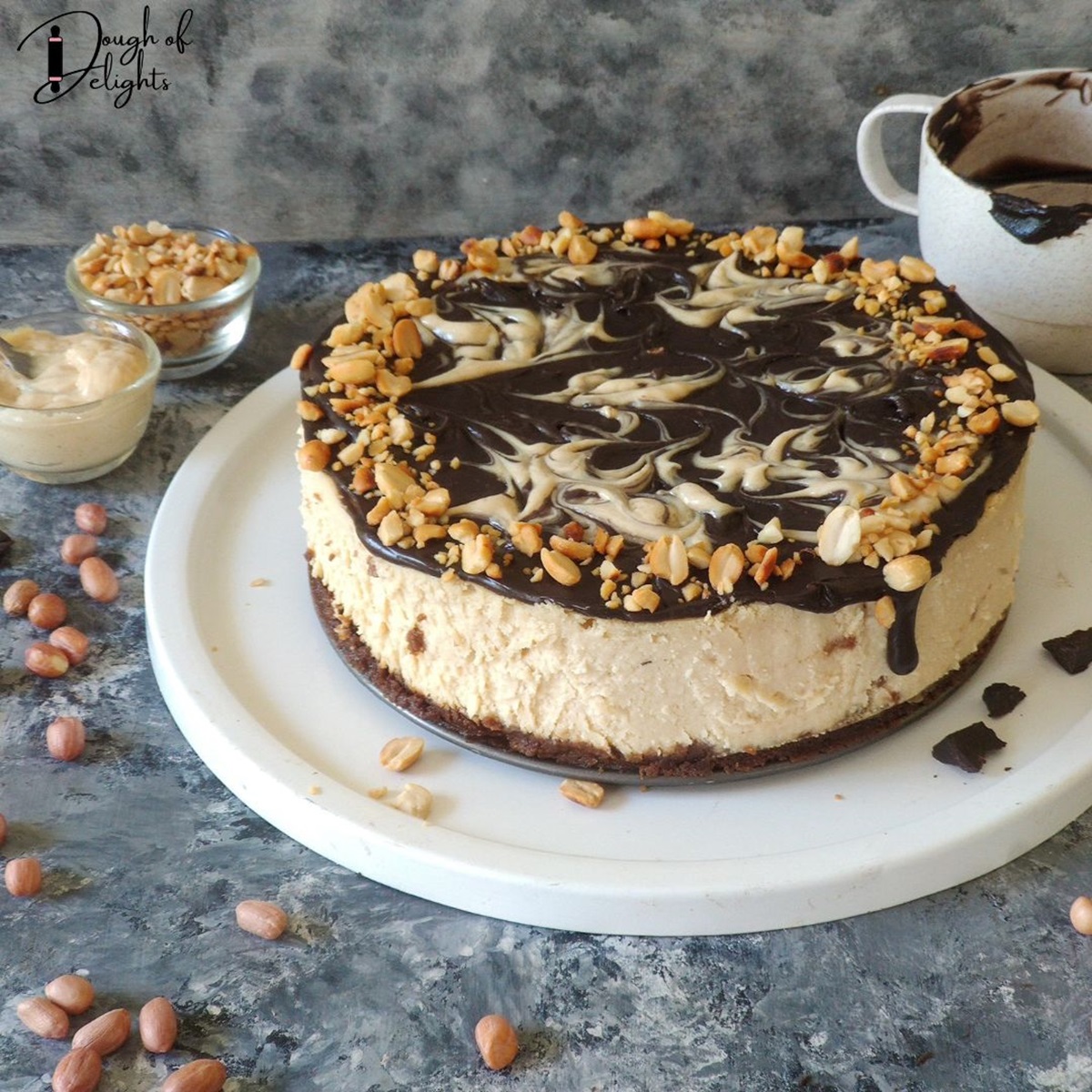 3. Spread chocolate ganache on the cheesecake, dollop peanut butter ganache, and swirl. Garnish with roasted peanuts.