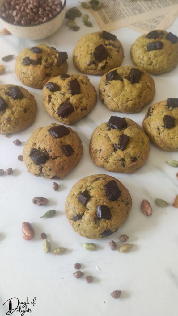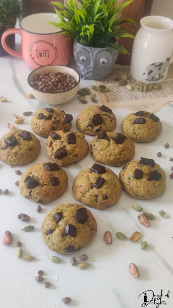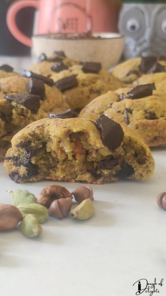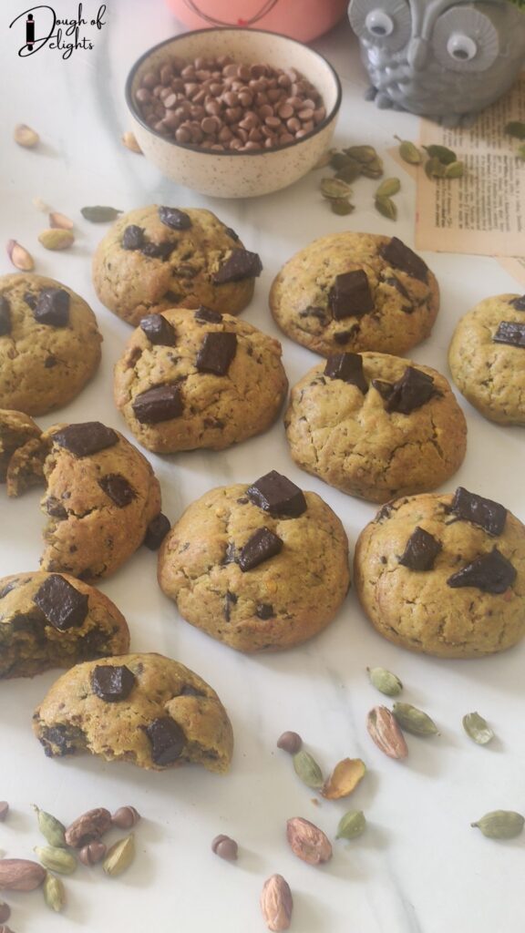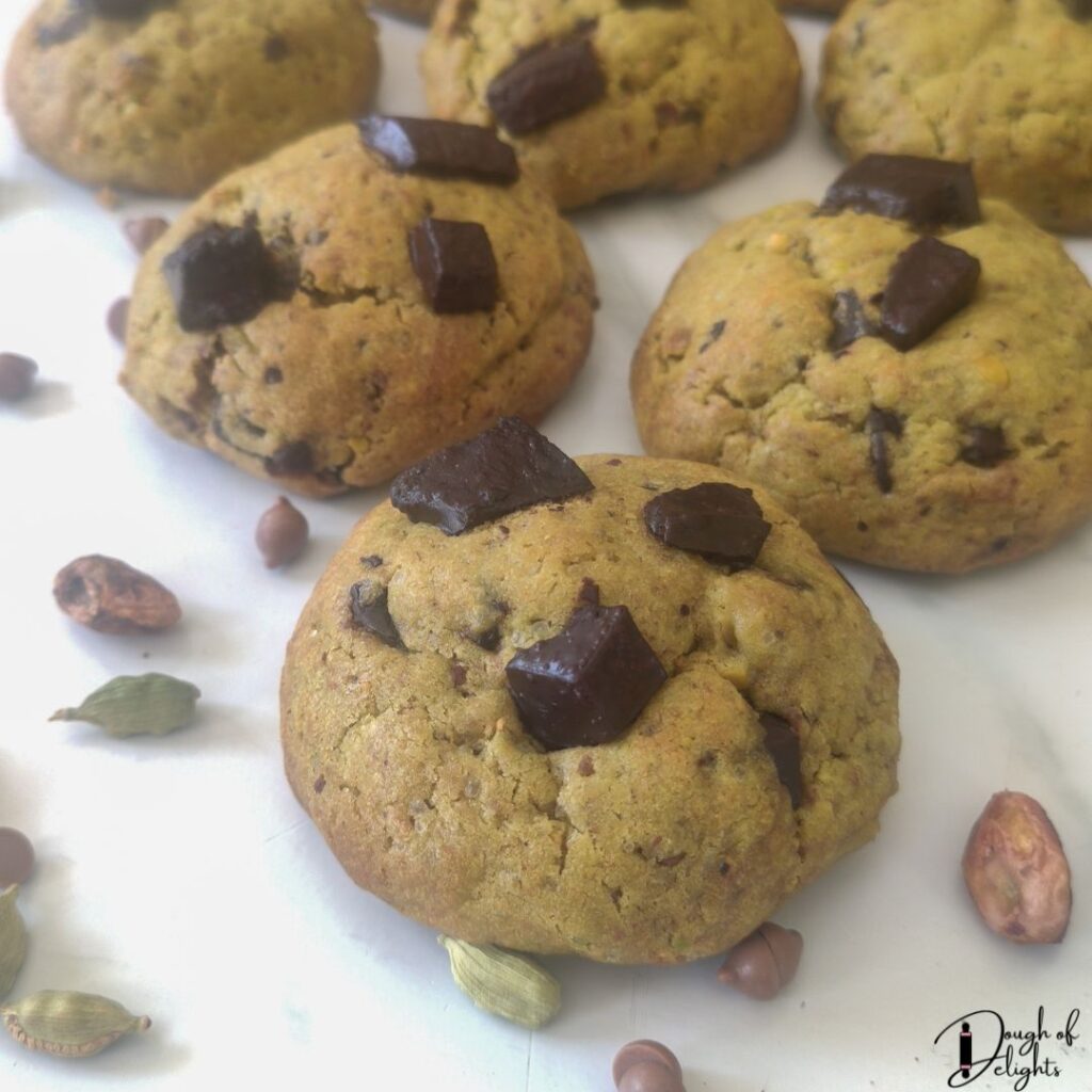 What makes these pistachio cardamom chocolate cookies so special is how they celebrate the spirit of Diwali- they’re indulgent yet comforting, familiar yet a little unexpected. They bridge that beautiful gap between mithai and cookies, giving you a festive treat that feels like home but with a bakery-style glow-up.
