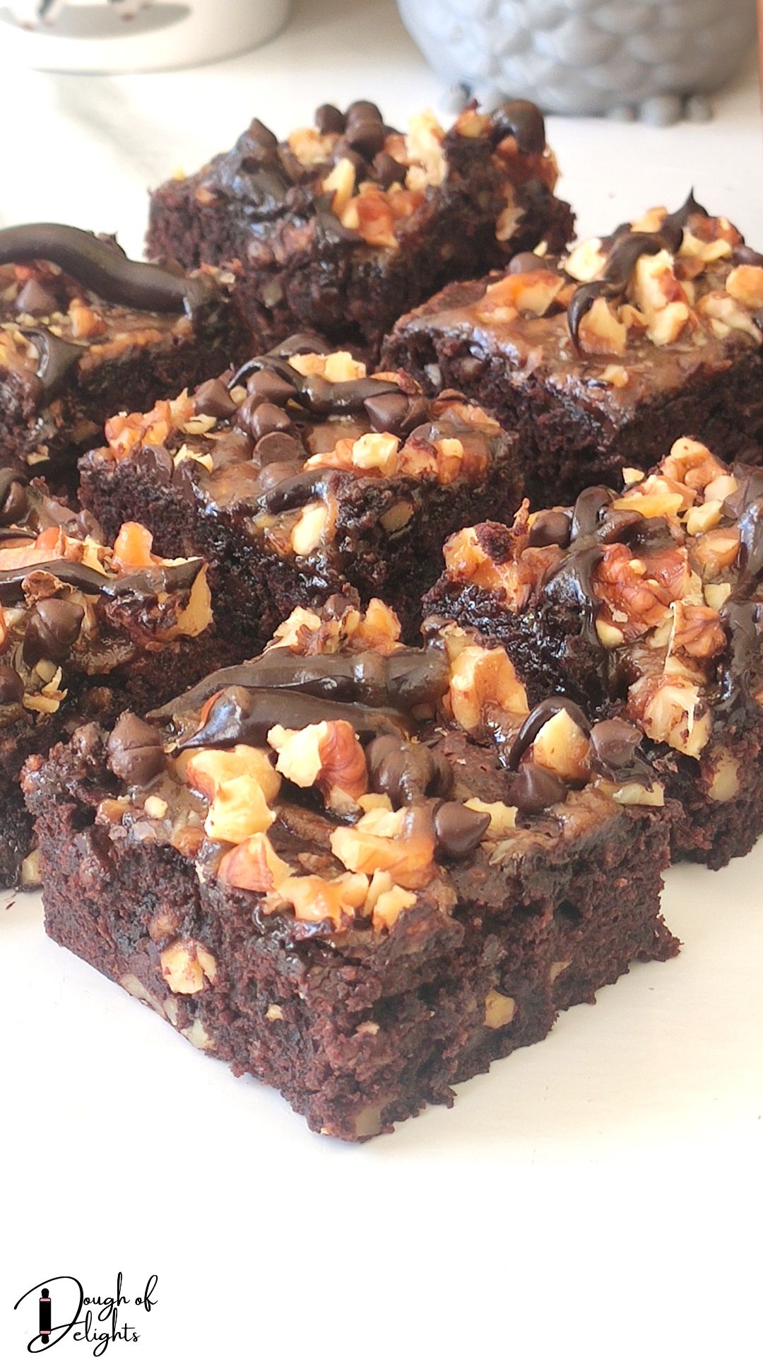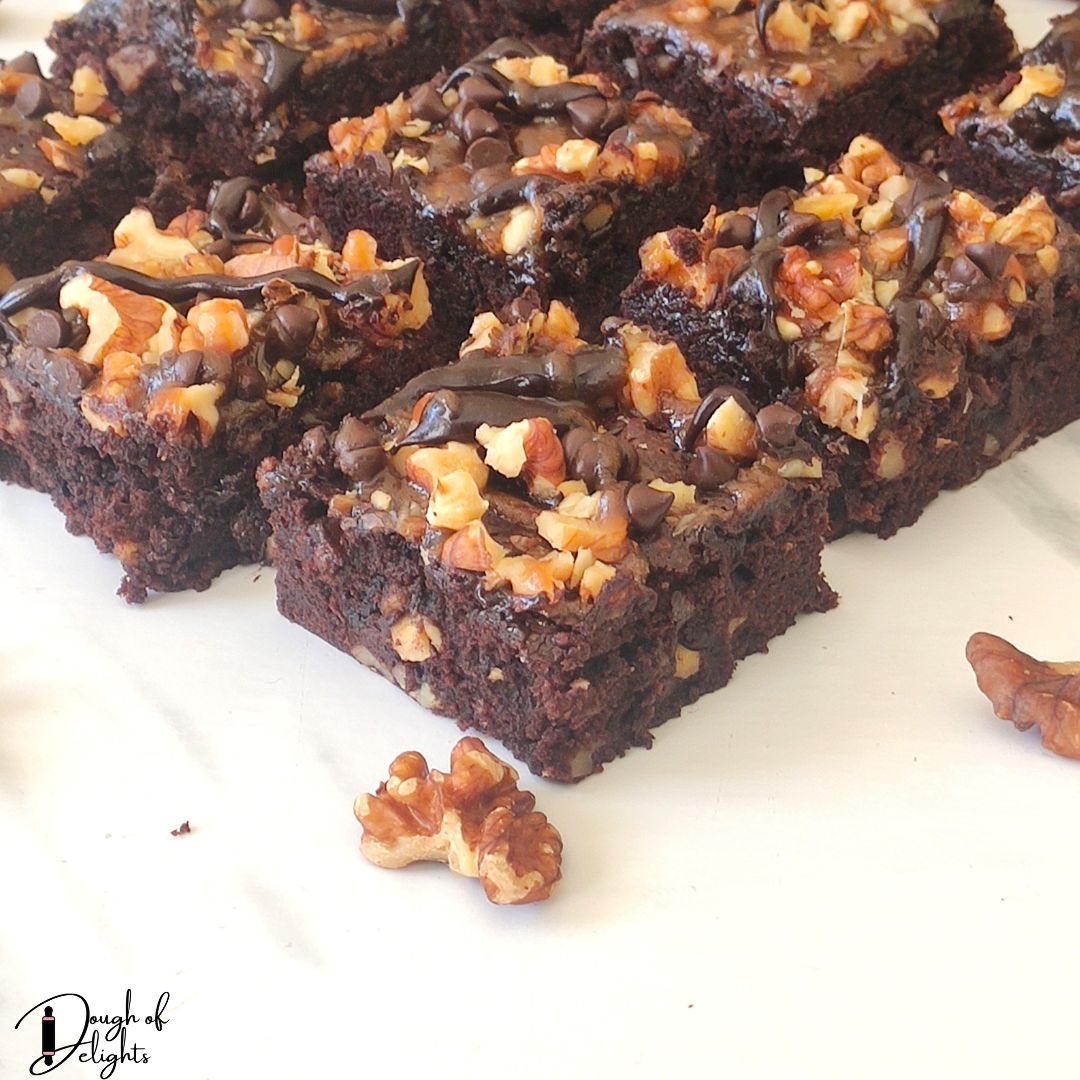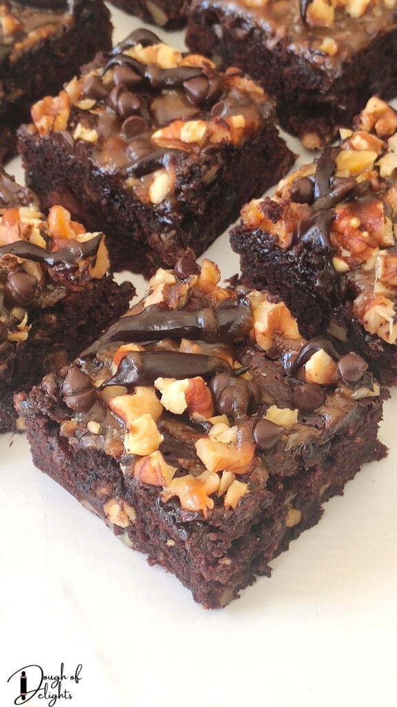 - Caramel topping: While still warm, drizzle caramel sauce over the brownies. Sprinkle more chopped walnuts and some chocolate chips on top.