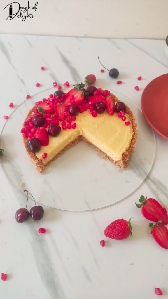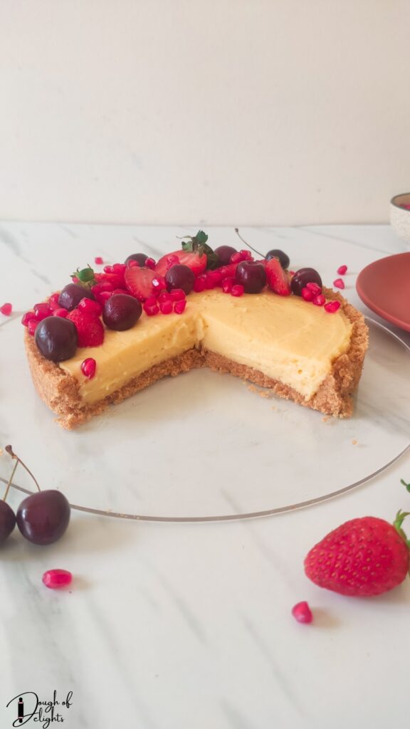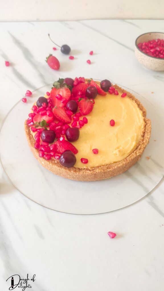 Make-ahead– The biscuit base can be stored in the fridge or freezer for up to 1 week. And the vanilla custard can be stored in the fridge for 2-3 days. Assembled tart would require 4 hours to set. Then garnish with fruits before serving.